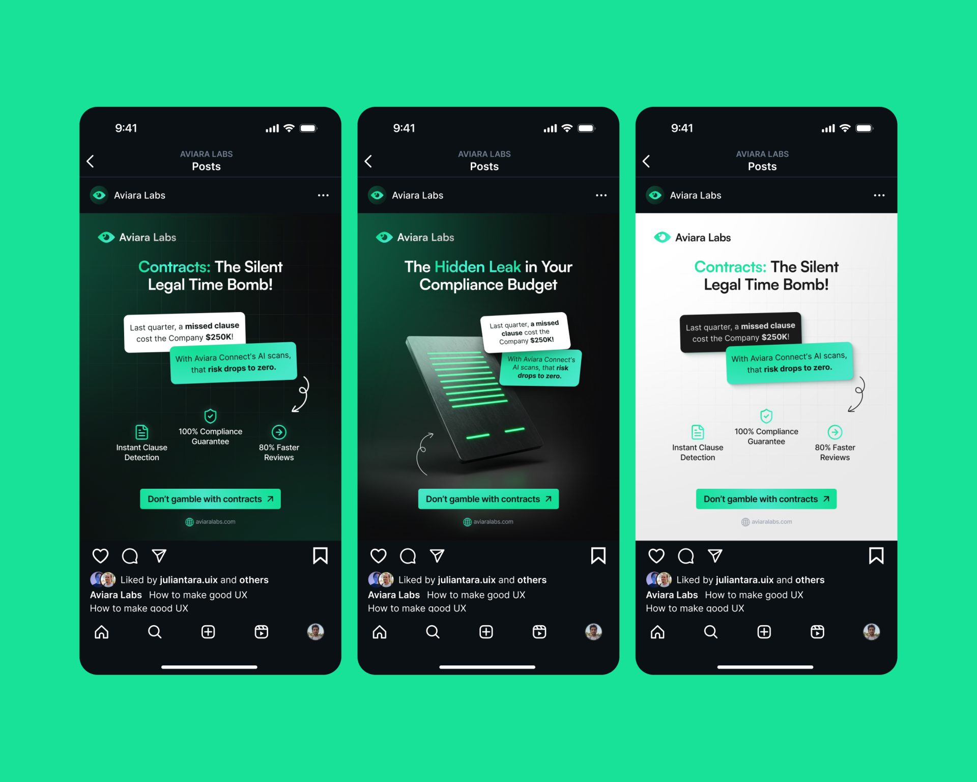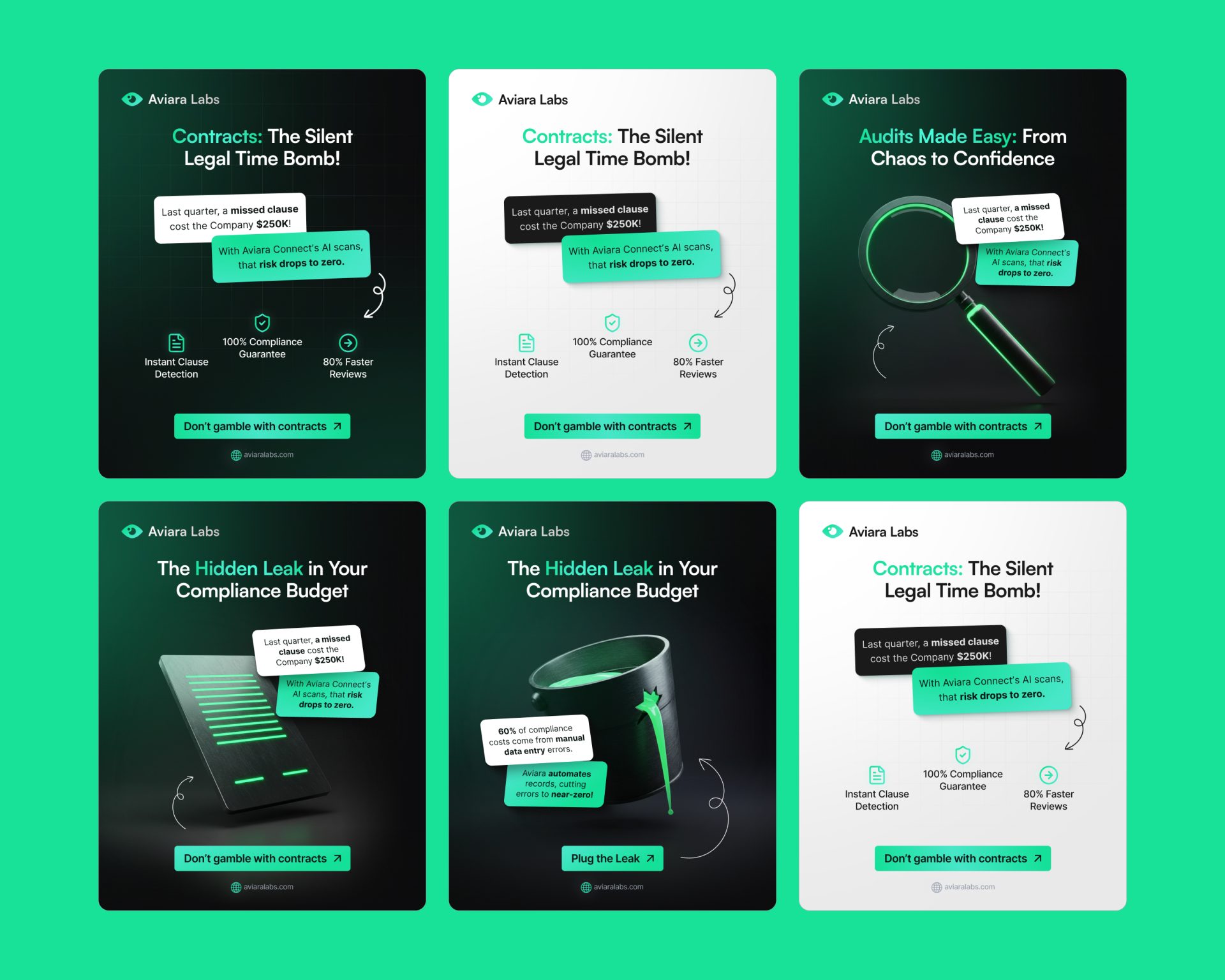 Designed a visually driven ad campaign for Aviara that transforms complex contract and compliance risks into clear, engaging narratives, using strong visual metaphors and data points to highlight the real cost of inaction and the value of faster, smarter contract reviews across multiple touchpoints.